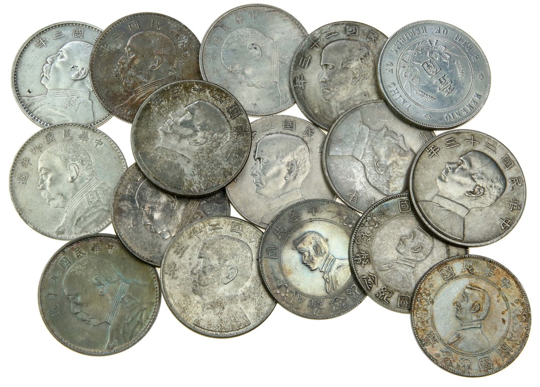 China, Republic, silver Dollars (16), Yuan Shih Kai (6), year 3 (2), year 9 (3), and year 10 (1), Sun Yat Sen, undated 'momento' Dollars (4), all with rosette on reverse (1927), and Sun Yat Sen, rev. junk (6), year 22 (1) and year 23 (5), average very fine, some better (16)