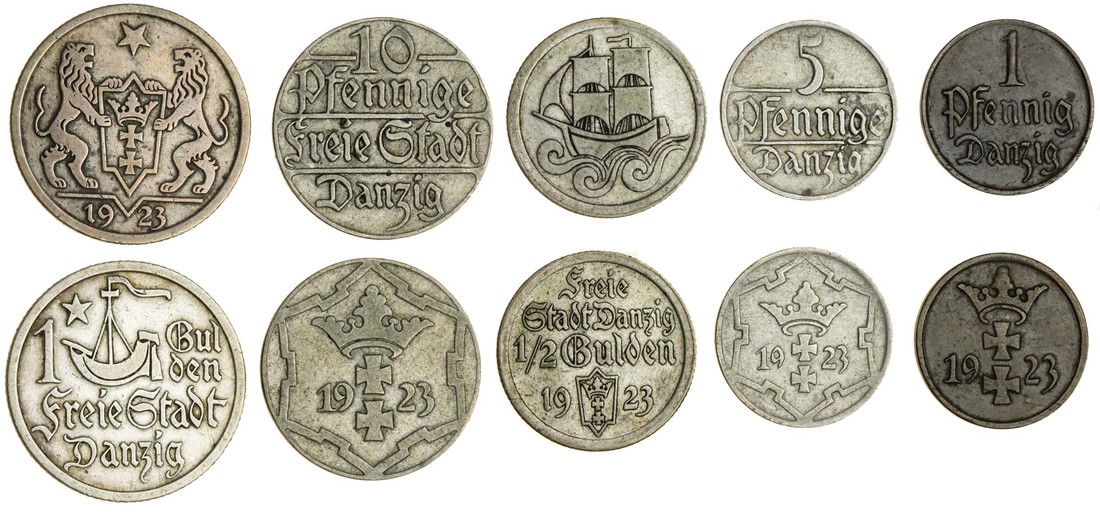 Danzig, Gulden, Half-Gulden, 10-Pfennig, 5-Pfennig and Pfennig, all 1923 (KM.145, 144, 143, 142 and 140), very fine (5)