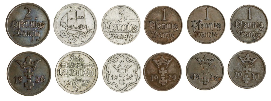 Danzig, Half-Gulden, 1927, 5-Pfennig, 1928, 2-Pfennig, 1926, and Pfennigs (3), 1926, 1029, 1930, (KM.144, 142, 141, 140), very fine or better (6)