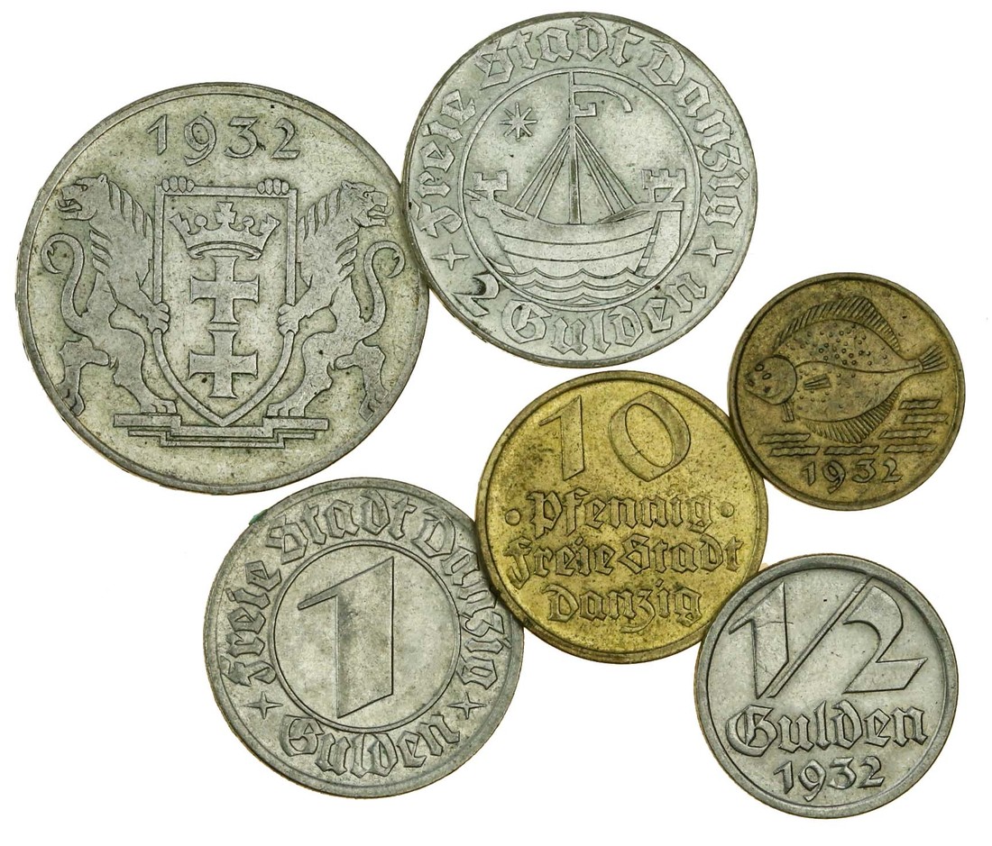 Danzig, set of 1932 coins, 5-. 2-. 1-. and 1/2-Gulden, 10- and 5-Pfenig (KM.157, 155, 154, 153, 152, 151), very fine and better (6)