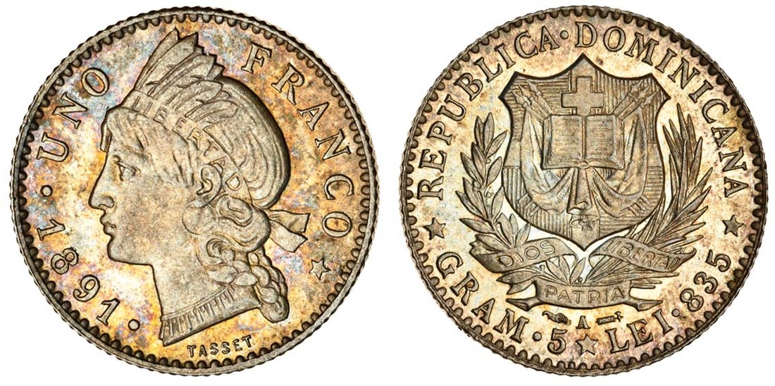 Dominican Republic, Reform Decimal Coinage, Franco, 1891A, head left, rev. arms (KM 11), uncirculated, lustrous and with light toning