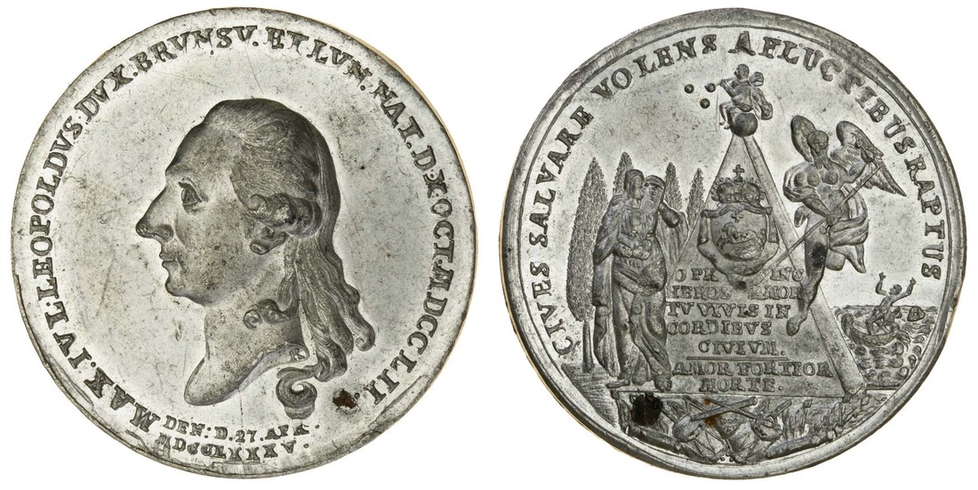 Germany, Brunswick-Wolfenbüttel, Karl Wilhelm Ferdinand (1780-1806), on the death of his brother Maxilian Julius Leopold, 1785, white metal medal by J. C. Reich, head of Maximilian left, signed r on truncation, date of his death below, rev. pyramid with crowned shield, a putto seated above, a mourning woman standing at left and Time standing at right, 43mm., extremely fine, very rare