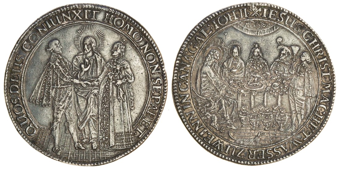 Germany, Hamburg, Wedding Double-Taler, 57.86g., undated (17th century), quos deus coniunxit homo non separet, Christ belssing a couple, rev. iesus christ machet wasser zu weinn in cana gal ioh ii, the wedding feast at Canan, Christ and his Mother at left, the bride and groom in the centre, the host standing to right raising a glass, six wine jars on the floor, and a dog in front, 64mm. (cf Gaedechens II, p.144, no.3 - similar scene but without the dog on the reverse), marks on the edge where removed from a mount, very fine, an interesting variety with a dog on the reverse