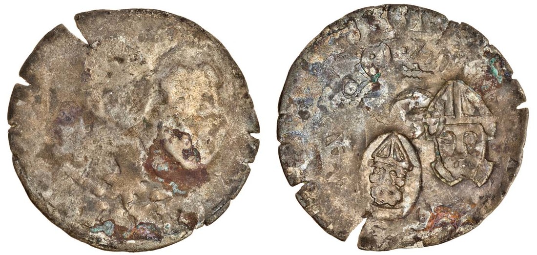 Germany, Isny and Konstanz, Prague Groschen, 2.48g, of Wenzel III (1378-1419), with horseshoe counterstamp for Isny (C.69), and two counterstamps of Bishop heads for Konstanz (C.82, 83), very fine, very rare