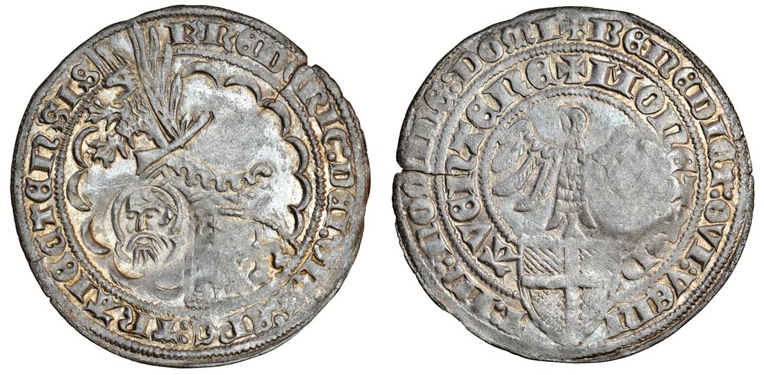 Germany, Münster, head of St Paul countermark on Double Gros, 3.51g, of Utrecht, Frederick III von Blankenheim (1393-1428), mint of Deventer, shield and helm, counterstamp to left of helm, rev. eagle above shield (Peus 8), small flan split at 3 o'clock, otherwise extremely fine