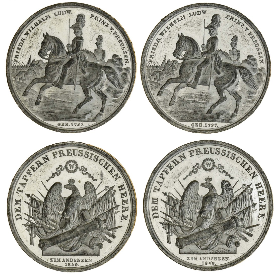 Germany, Prussia, Prince Friedrich Wilhelm Ludwig, white metal medals (2), den tapfern preussischen heere 1849, the Prince on horseback, rev. military trophy, 40mm., both extremely fine (2)