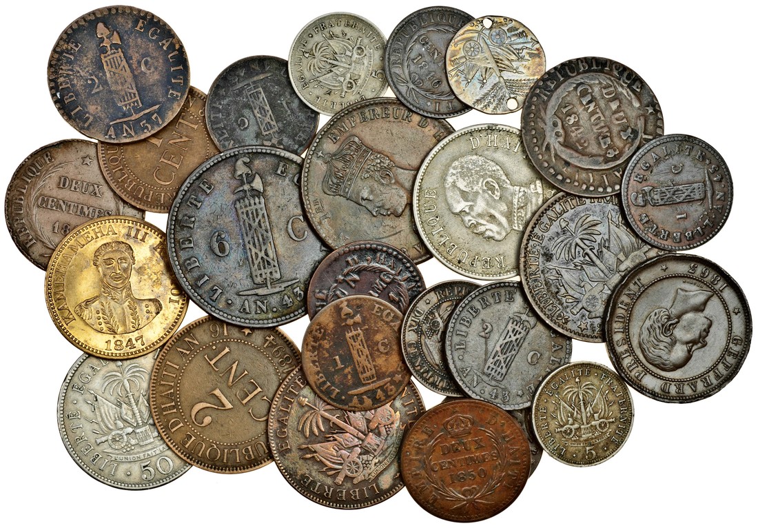Haiti, Republic, silver and base metal coins (25), 50-Centimes (2), 1907, 1908 (KM 56), 25-Centimes, AN 13 (1816) (KM 12.2), 20-Centimes, 1863H (KM 41), 10-Centimes, 1863H (KM 40), 6 1/4-Centimes, 1850 (KM 38), 6-Centimes, 1846 (AN 43) (KM 28), 5-Centimes (2), 1904, 1905 (KM 53), 2-Centimes (8), 1840 (AN 37), 1842 (AN 39) 1846 (2) (AN 43), 1850, 1881, 1886, 1894 (KM 26, A22, 36), Cent (8), 1834 (AN 31), 1840 (AN37), 1841 (AN 38), 1846 (AN 43) (4) 1886 (AN 83) (KM 43, A21, 25.1, 49), mixed, mostly fine to very fine (25)