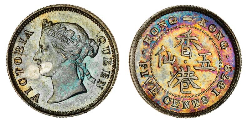 Hong Kong, Victoria (1837-1901), 5-Cents, 1879, crowned bust left, rev. value and date (KM 5), uncirculated, with old, colourful, toning