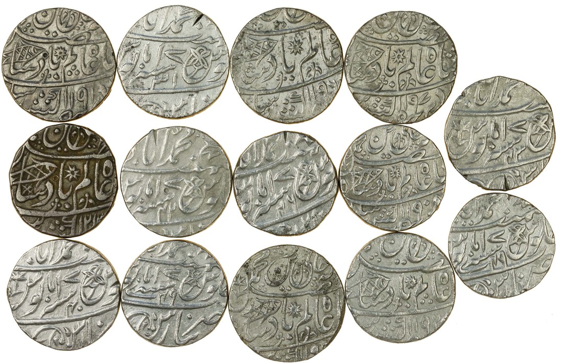 India, East India Company, Bengal Presidency, Rupees (14), Banaras, 1190/17, 1191/17, 1192/17, 1195/17/23, 1196/17/24, 1197/17/25, 1203/17/31, 1212/17/40, 121(3)/17/41, 1214/17/42, 1215/17/43, 1219/17/46, 1223/17/49, 1225/17/49 (Pr. 219, 220, 221, 225, 226, 227, 237, 255, 257, 259, 261, 269, 277, 279; KM 40), generally very fine (14)