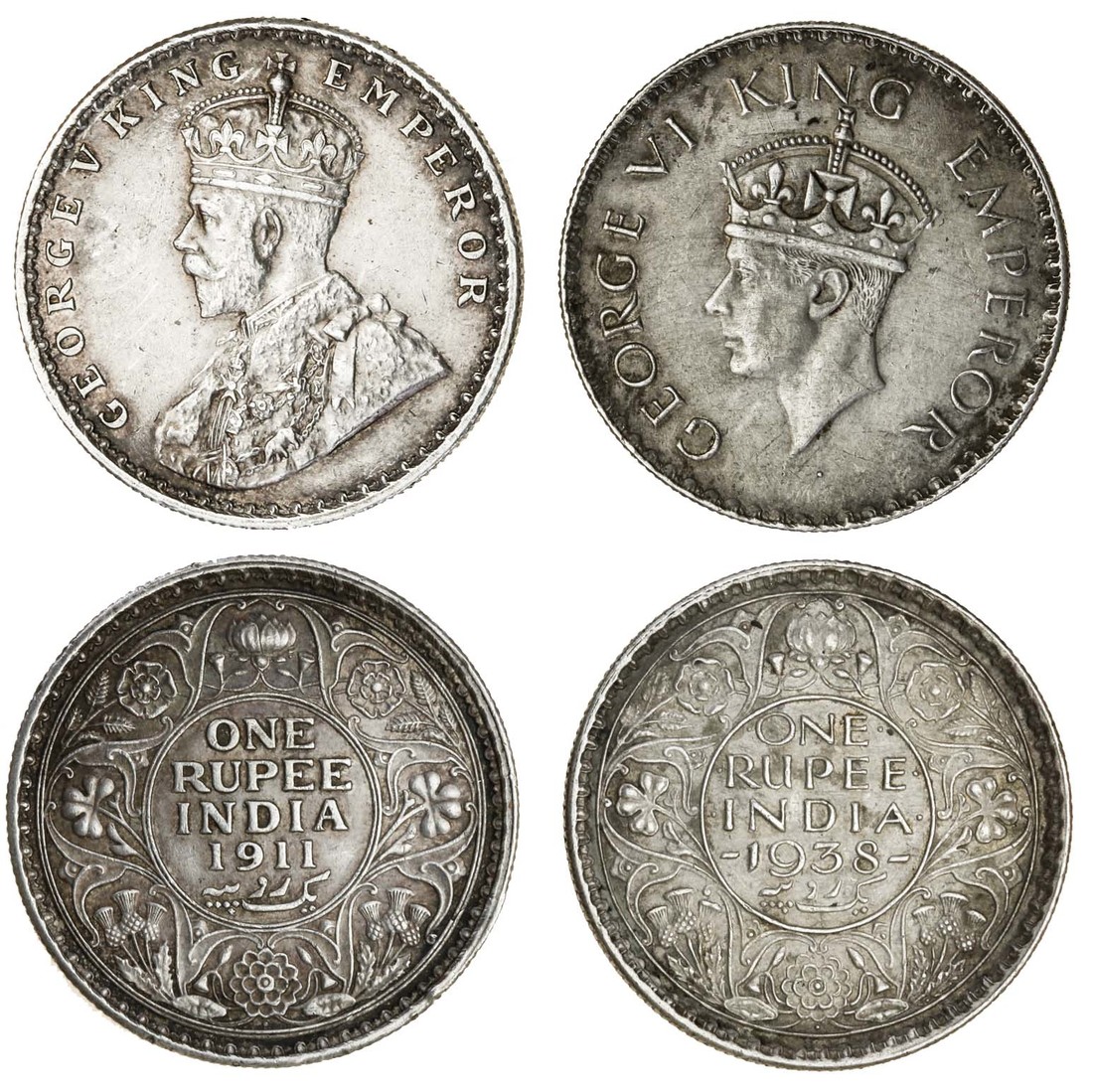 British India, George V (1911-36), 'Pig Rupee,' 1911B George VI (1937-52), Rupee, 1938B, with bead (S&W. 8.15, 9.11; KM.523, 555), the first with a small reverse edge dent, the second a little dirty, both good very fine and scarce (2)