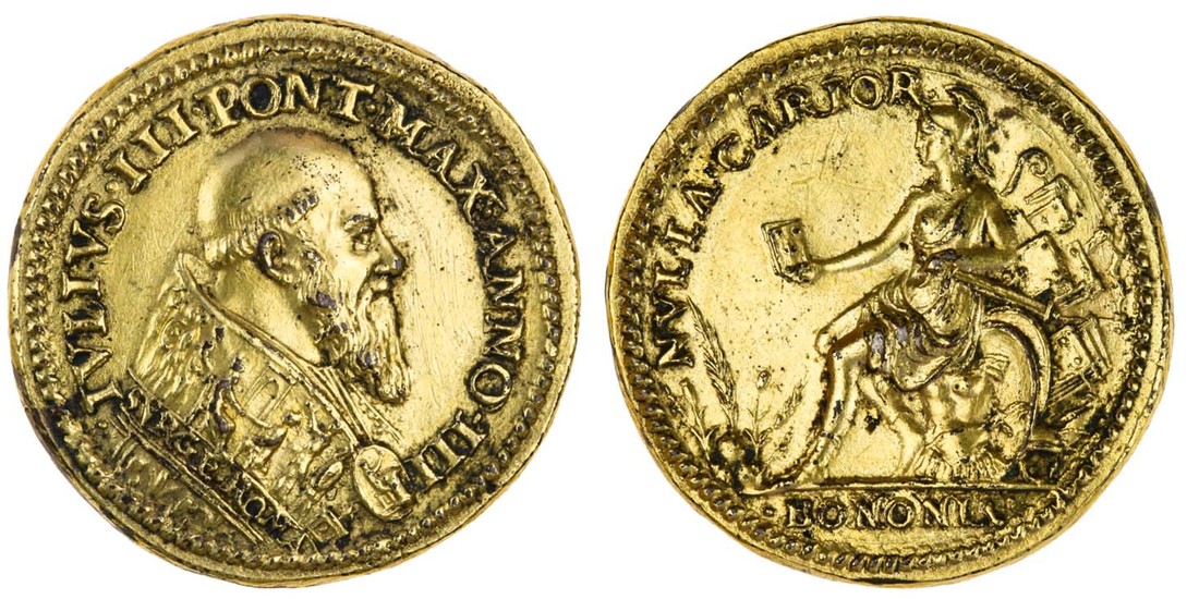 Italy, Bologna, Julian III (1550-55), bronze gilt medal, bust right wearing richly embroidered cope with svrge roma, rev. nvlla carrior bononia, allegorical figure of Bologna seated holding book, 30mm. (Armand III, 258G; Bonanni I, 243,25; TN IX,8), good very fine, very rare