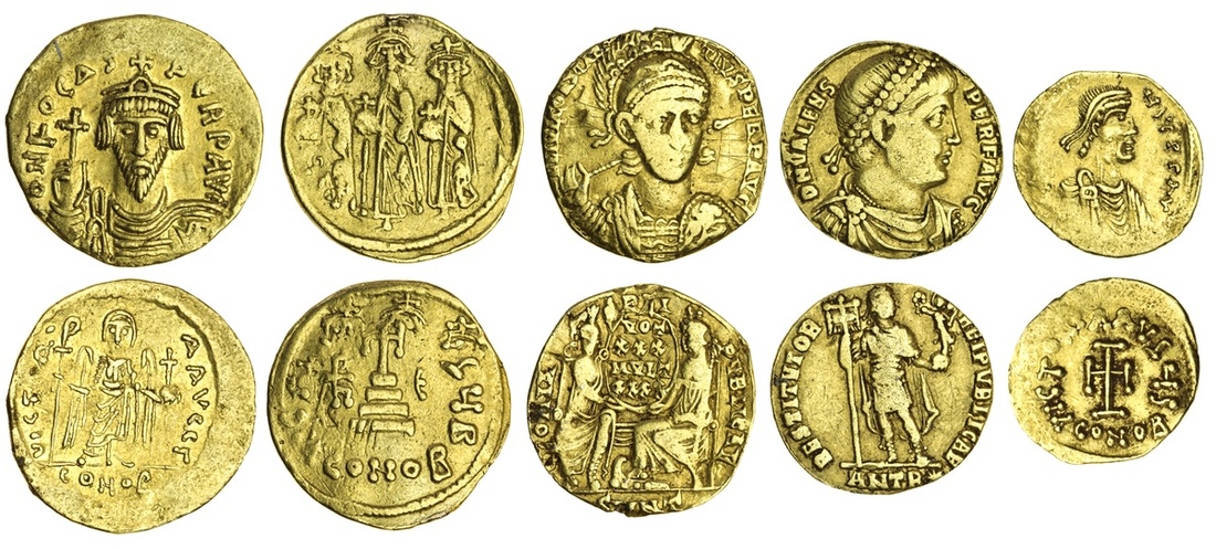 Late Roman and Byzantine gold coins (5), comprising a Solidus of Constantius II, facing armoured bust type from Nicomedia, clipped, some scratches, fine; a Solidus of Valens struck at Antioch, removed from jewellery, clipped, good fine; together with Solidi of Focas, very fine; Heraclius, three standing figures type, traces of overstriking on reverse, good fine; and a Tremissis of Constans II, about very fine (5)