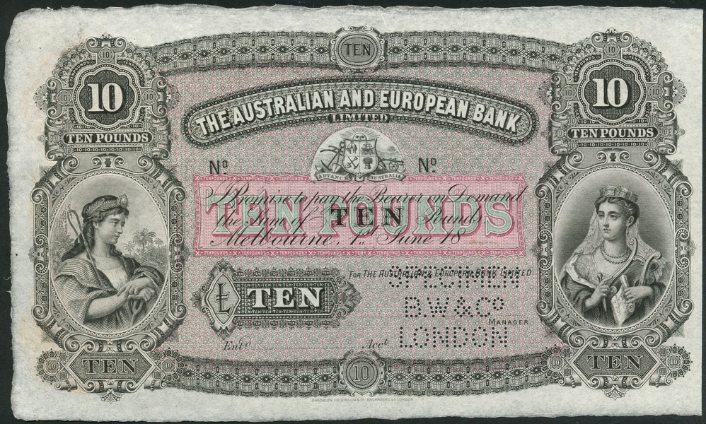 (†) The Australian and European Bank Limited, specimen, £10, Melbourne, 1 June 18-, black on grey, pink and green, arms at upper centre, shepherdess at left, turreted maiden at right, value at top left and right, reverse lilac, blue and orange, value in ornate guilloches, perforated SPECIMEN BW & Co LONDON