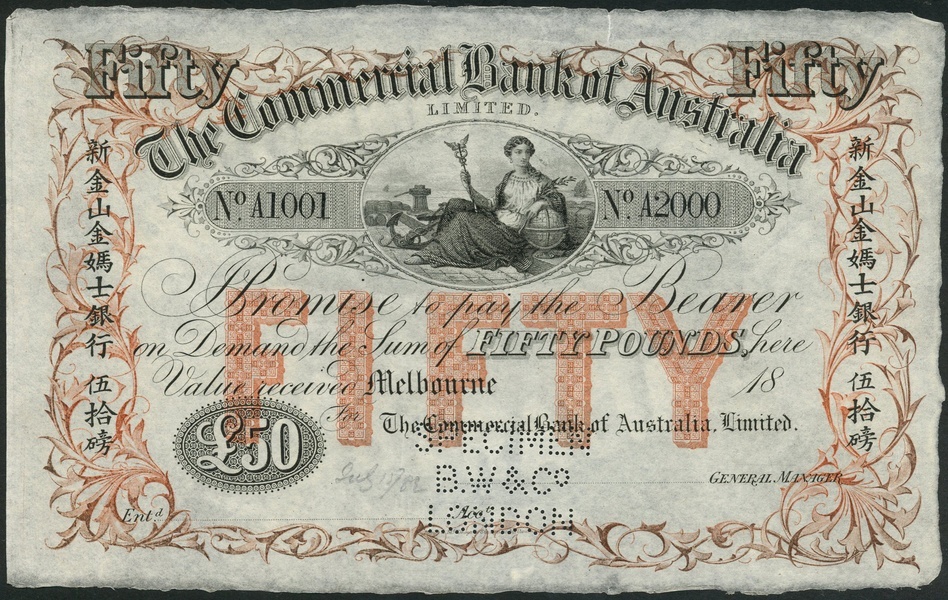 (†) Commercial Bank of Australia, specimen £50, Sydney, 18-, serial number A 1001-A2000, black text , pale red and white, value in pale red underprint at centre, maiden with caduceus top centre, Chinese text at left and right (for use by Chinese workers in the Australian goldfields), reverse blue-green, value at centre, medallic female head at left and right