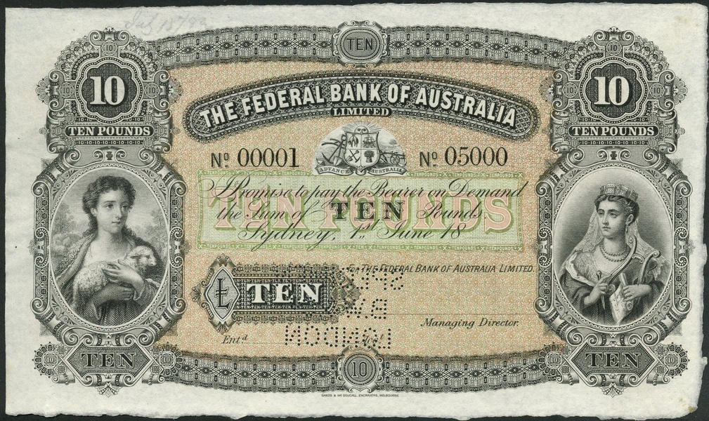 (†) Federal Bank of Australia, printer's archival specimen £10, Sydney, 1 June 18-, serial number 00001-05000, black and light green and pink, woman with lamb at left, woman with turreted coronet at right, reverse brown and light green, value at centre and in guilloches at left and right, perforated SPECIMEN BW & Co LONDON