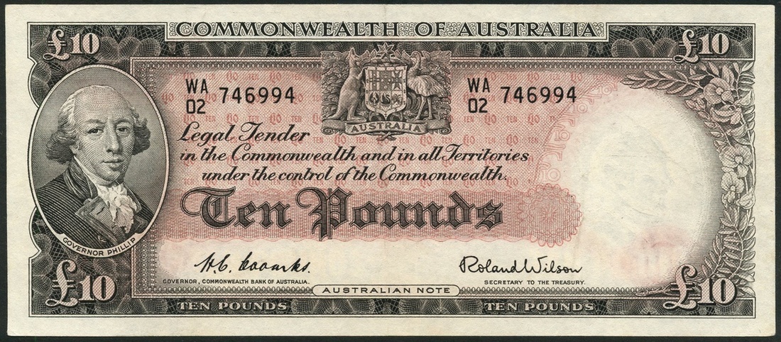 (x) Commonwealth of Australia, a set from the 1953-4 issue, 10/-, prefix AF/55, black on orange, £1, prefix HB/54, black on green, £10, prefix WA/D2, black on pink and £5 from the 1960 issue, prefix TC/99, black on blue, all with Coombs and R. Wilson signature
