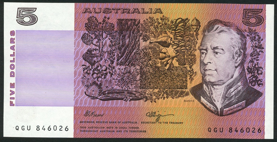 Reserve Bank of Australia, $5 (4), ND (1990), all serial number 846026, with four different prefixes, QGR, QGS, QGT and QGU, black on orange and purple underprint, Sir Joseph Banks at right