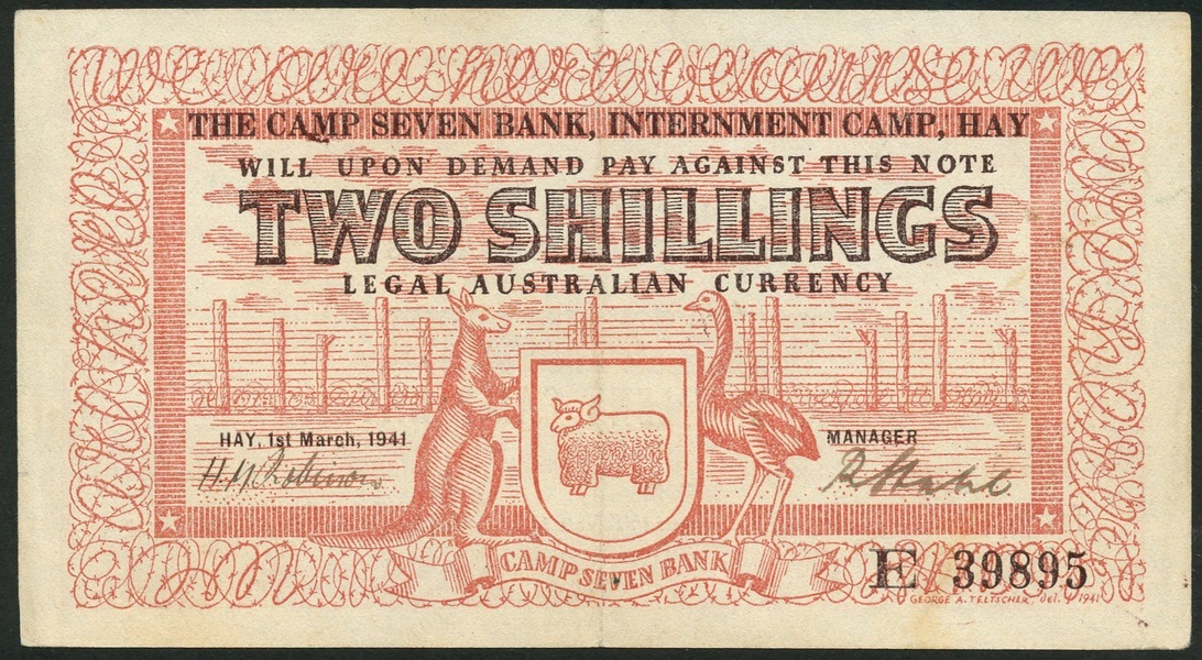 Hay Internment Camp, Australia, two shillings, 1 May 1941, serial number E39895, uniface, black text on red underprint, merino sheep on shield flanked by kangaroo and emu low centre, Robinow/Stahl signature