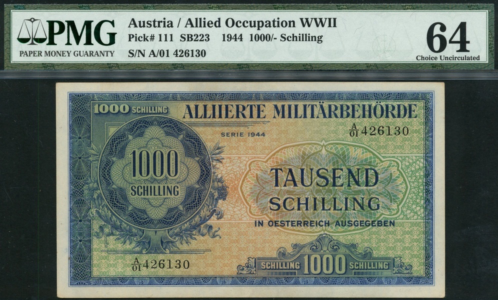 (x) Austria, Allied Occupation WWII, 1000 schillings, 1944, serial number A/01 426130, blue on light green and orange underprint, value in ornate tablets at left and right, reverse, value within elaborate panel