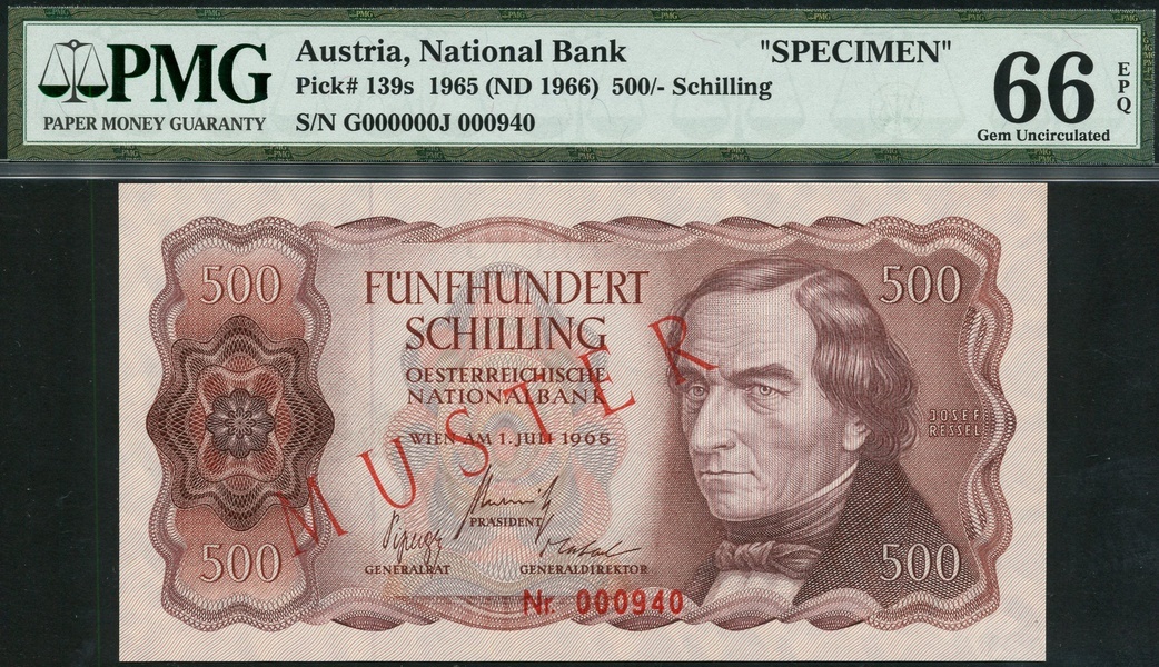 (x) National Bank, Austria, specimen 500 schillings, 1 July 1965, serial number Nr 000940, brown on light brown, portrait Josef Ressel at right, guilloche patterns, reverse, ship at centre left, arms centre right