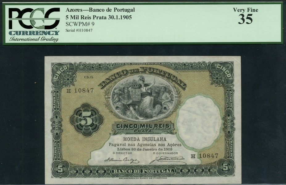 (x) Banco de Portugal, Azores, 5 mil reis, 30 January 1905, serial number H10847, green and tan, seated allegories of Portugal and two rivers Tejo and Douro at top centre, value at left and corners, overprint at low centre