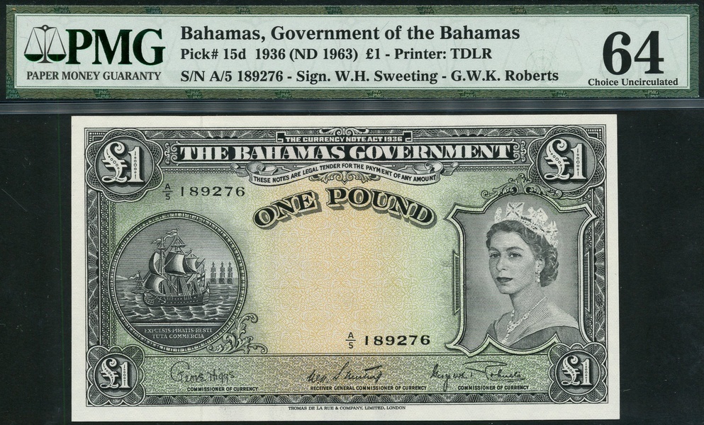 (x) Government of the Bahamas, £1, ND (1963), serial number A/5 189276, dark grey on light green and yellow underprint, portrait Queen Elizabeth II at right, ship seal at left, value in each corner and at top centre, reverse, guilloche patterns with arms at left and value at right
