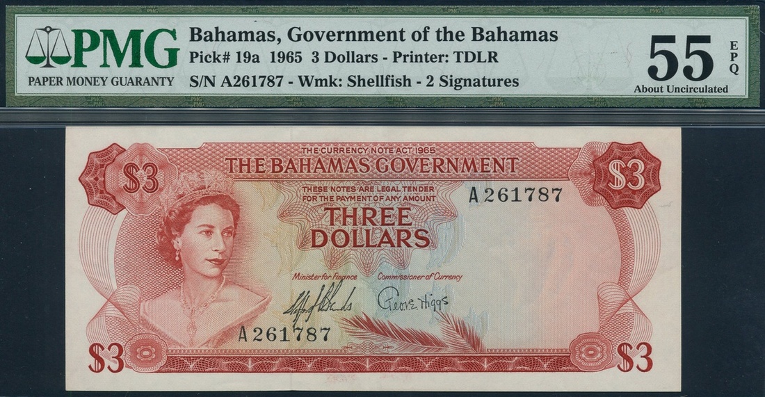 (x) Government of the Bahamas, $3, ND (1965), serial number A261787, red on multicolour underprint, Elizabeth II at left, value at each corner, reverse red and multicoloured, arms at right, beach scene at centre