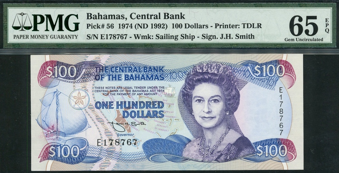 Central Bank of the Bahamas, $100, ND (1992), serial number E 178767, blue on multicolour underprint, portrait Queen Elizabeth II at centre right, boat in full sail at left, reverse, blue marlin at centre, arms low right