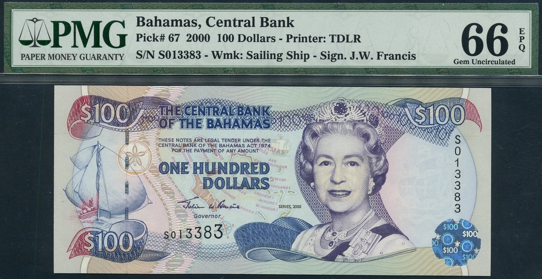 (x) Central Bank of the Bahamas, $100, ND (1967), serial number SO13383, blue on multicolour underprint, portrait Queen Elizabeth II at centre right, boat in full sail at left, map of islands in background
