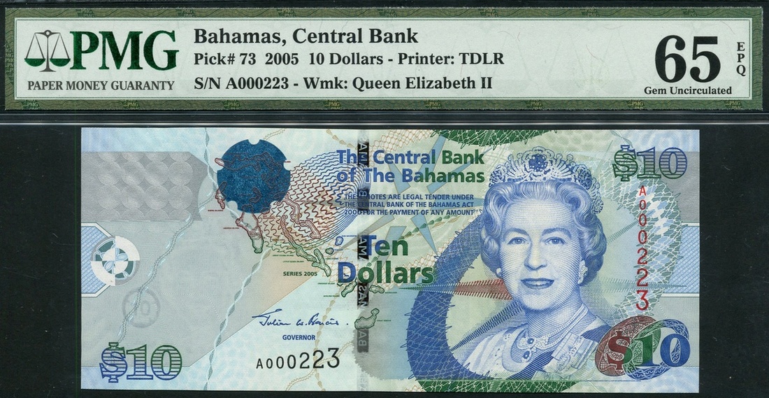Central Bank of the Bahamas, $10, 2005, serial number A 000223, blue on multicolour underprint, portrait Queen Elizabeth II at right, reverse, lighthouse with view of Hope Town in background, arms low centre