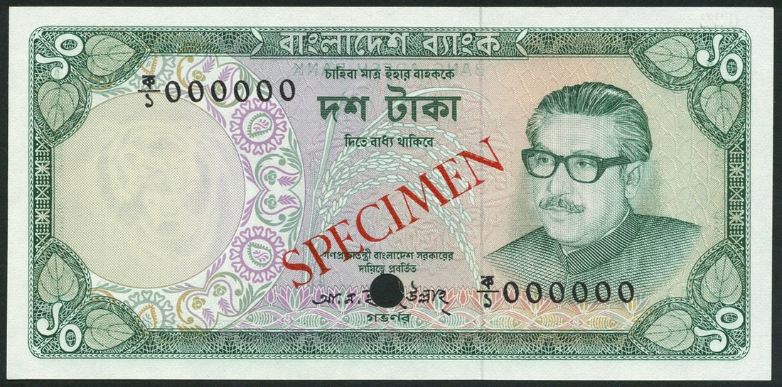 (x) Bangladesh Bank, specimen 5 Taka, ND (1973), serial number 000000, red and multicoloured, Mujibur Rahman at right, specimen 10 Taka, ND (1973), serial number 000000, green and multicoloured, Mujibur Rahman at right, all with overprinted SPECIMEN diagonally in red or black on obverse and reverse, all one punch hole