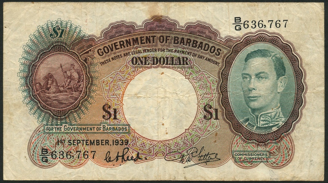 Government of Barbados, $1 (2), 1939, 1943, serial numbers B/G636,767 and B.L120,756, brown and green, portrait King George V at right, Central Bank of Ceylon, 5 rupees, 1952, serial number G/5 093679, purple on multicolour underprint, portrait Queen Elizabeth II at left, Government of British Guiana, $1 (4), 1938 (2), 1942 (2), red, toucan at left, waterfall at centre, ship seal at right