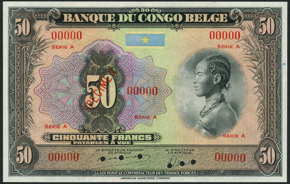 Banque du Congo Belge, specimen 50 francs, ND (1941/42), zero serial number, serie A, dark grey on multicolour underprint, woman at right, value in each corner and at centre left, foliage at left and right, reverse, leopard at centre
