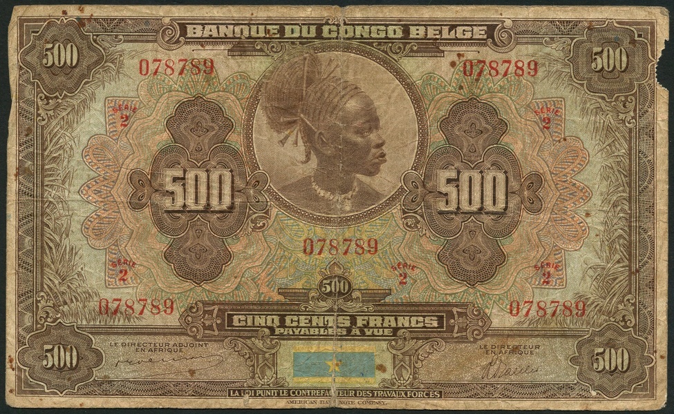 Banque du Congo Belge, 500 francs, ND (1941), serial number 078789, brown on multicolour underprint, Mangbetu woman at top centre flanked by value in ornate tablets, reverse, herd of elephants