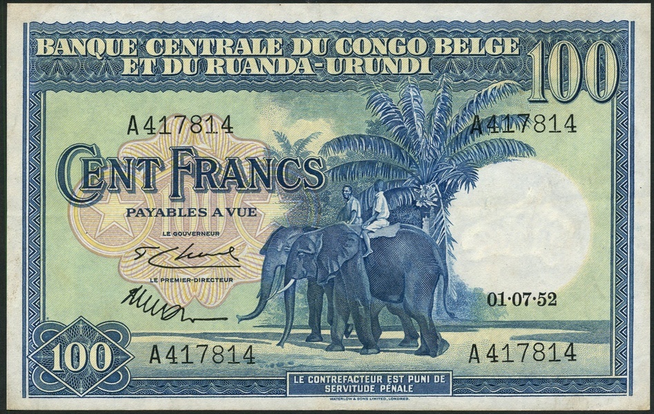Banque Centrale du Congo Belge et du Ruanda-Urundi, 100 francs, 1 July 1952, serial number A417814, blue and light green, elephants at centre with palm trees in background, bank title top centre left, reverse, farmer and herd of oxen
