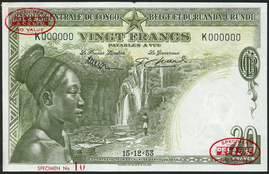 (†) Banque Centrale du Congo-Belge et du Ruanda-Urundi, specimen 20 francs, 15 December 1953, serial number K 000000, dark and pale green, girl at left, falls at centre, Martin and Charles signatures, reverse green and pink, Watusi warrior at right, Queen Astrid research building in Kinshasa at centre, star and bank building at centre