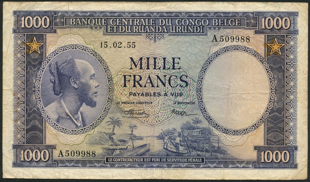 Banque Centrale du Congo Belge et du Ruanda-Urundi, 1000 francs, 12 February 1955, serial number A509988, blue on multicolour underprint, portrait of Moliro man at left, canoes on river low centre, ornate border, reverse, waterbuck