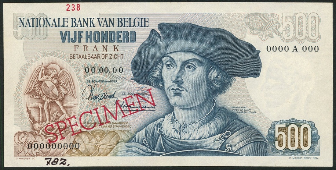 Banque Nationale de Belgique, specimen 500 francs, ND (1961-75), serial number 0000 A 000, grey-blue on multicolour underprint, portrait Bernard van Orley at centre, allegorical figure at left, reverse, portrait Margaret of Austria