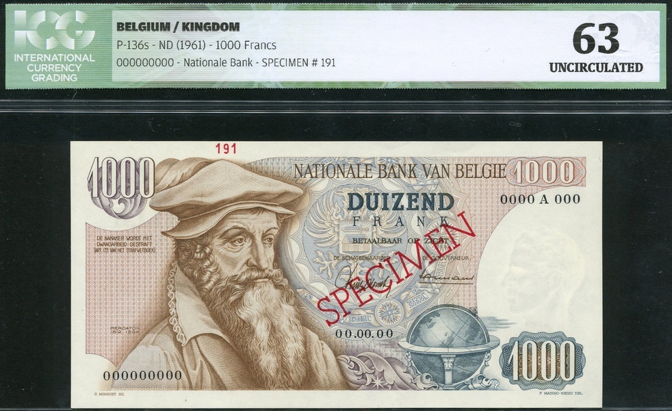 Banque Nationale de Belgique, specimen 1000 francs, zero date and serial number, light brown on pale blue, portrait Gerard Kremer at centre left, globe low right, reverse, depiction of Atlas, boat in full sale in background