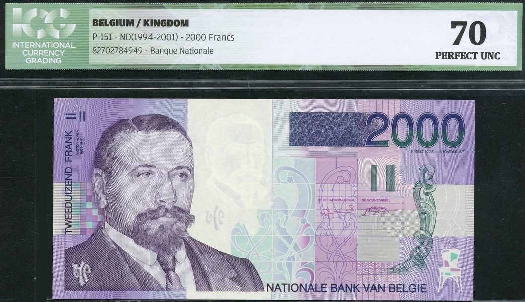 Banque Nationale de Belgique, 500 francs, ND (1980-81), serial number 40709208516, dark blue on multicolour underprint, portrait Constantine Meunier at centre left, mine conveyor tower in background, also, 2000 francs, ND (1994-2001), serial number 82702784949, purple and multicolour, portrait Victor Horta at left