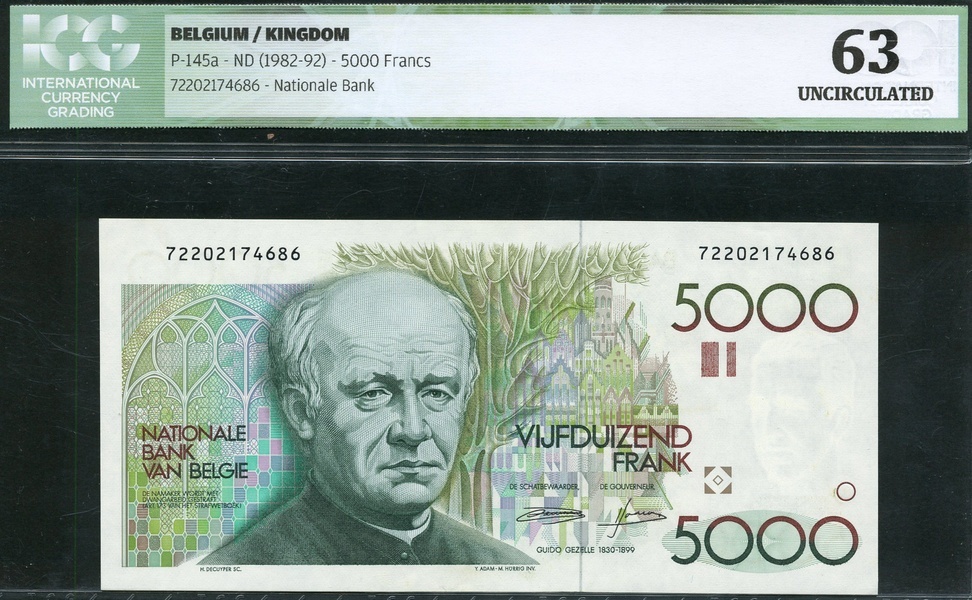 Banque Nationale de Belgique, 5000 francs, ND (1982-92), serial number 72202174686, green on multicolour underprint, portrait Guido Gezelle at centre left, stylised tree and stained glass window in background, reverse, dragonfly and leaf