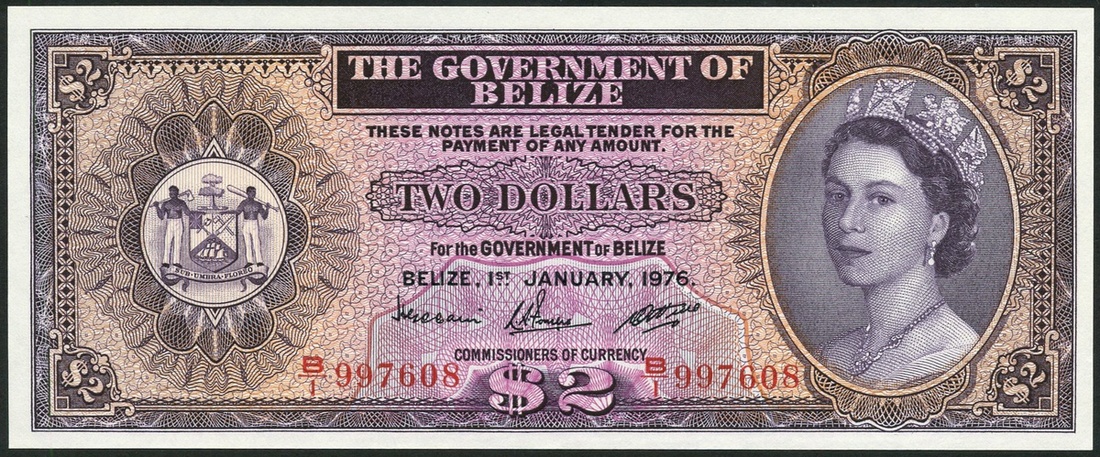 Government of Belize, $2, 1 January 1976, serial number B/1 997608, purple, violet and pale orange, portrait Queen Elizabeth II at right, arms at left, reverse, guilloche patterns