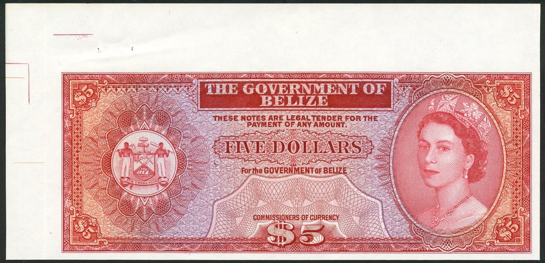 (x) Government of Belize, obverse and reverse proofs $5 (2), ND (1975), no serial number, first; obverse red on multicolour, arms at left, Elizabeth II at right, reverse multicolour, guilloche pattern, second; obverse purple and orange guilloche pattern, reverse, multicolour guilloche pattern