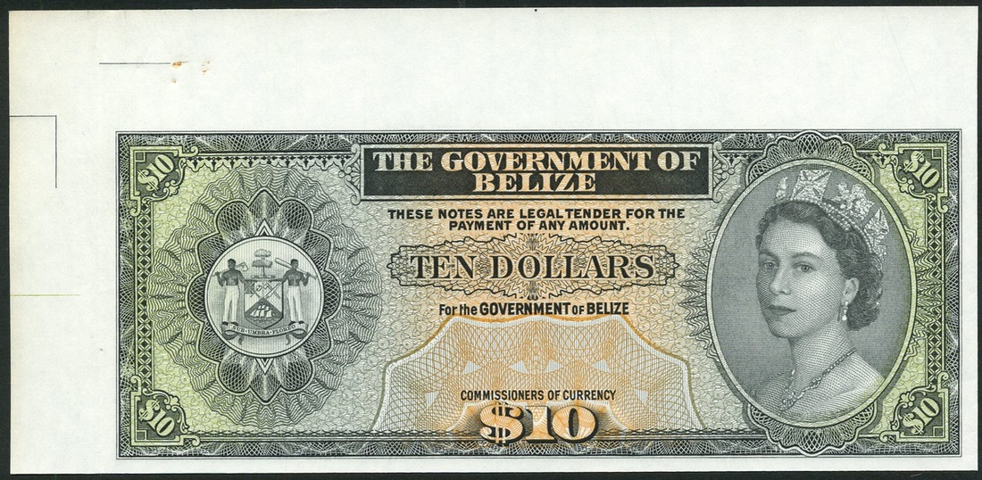 (x) Government of Belize, obverse and reverse proofs $10 (2), ND (1975), no serial number, first; obverse black on green and orange, arms at left, Elizabeth II at right, reverse multicolour guilloche pattern, second; reverse multicolour guilloche pattern