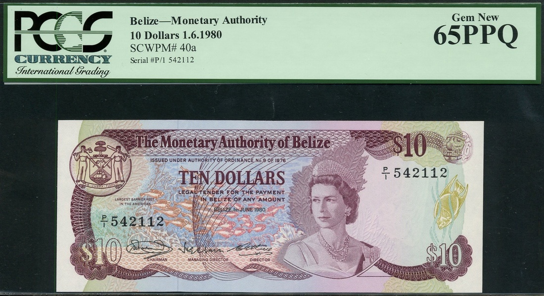 Monetary Authority of Belize, $5 and $10, 1980, serial numbers J/1 482087 and P/1 542112, red and purple respectively, portrait Queen Elizabeth II at centre right, tropical fish at centre, arms top left, reverses, National Assembly building