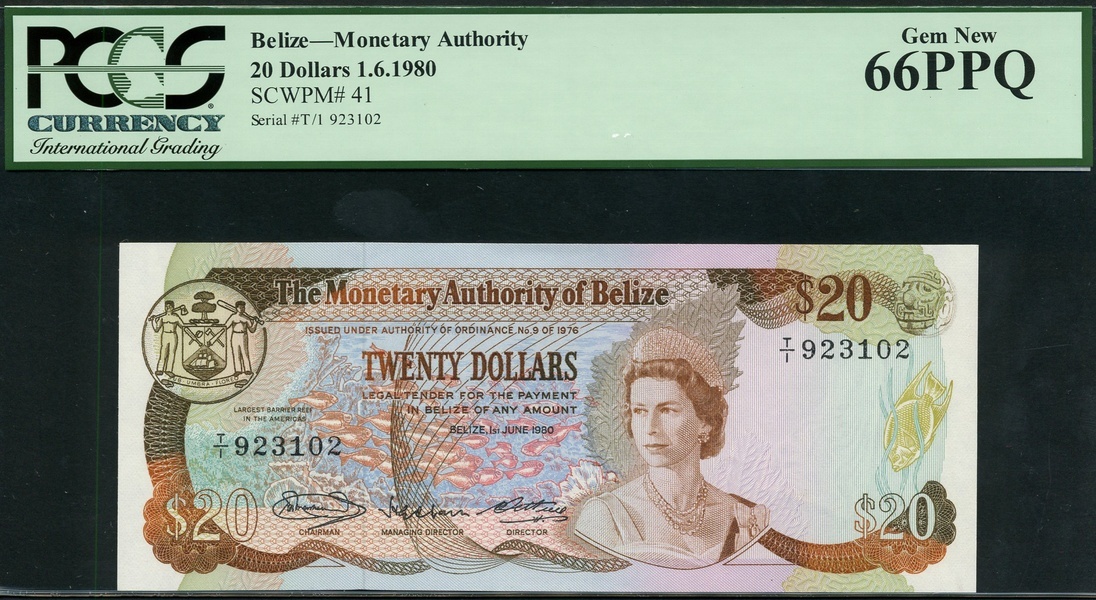 Monetary Authority of Belize, $20, 1980, serial number T/1 923102, brown on multicolour underprint, portrait Queen Elizabeth II at centre right, tropical fish at centre, arms top left, reverses, National Assembly building