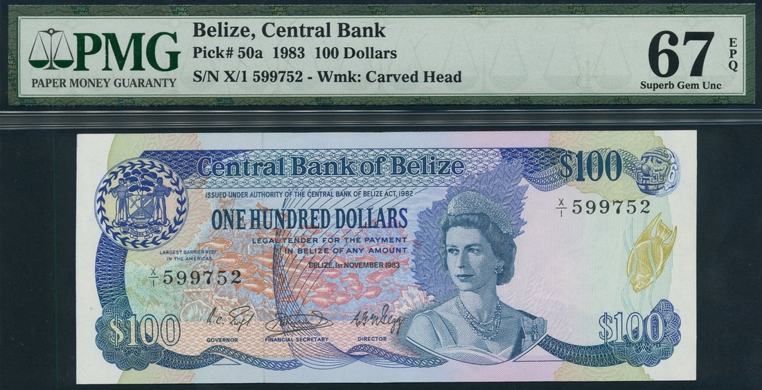 Central Bank of Belize, $100, 1 November 1983, serial number X/1 599752, blue on multicolour underprint, portrait Queen Elizabeth II at centre right, arms top left, tropical fish in background at centre, reverse, angel fish, green iguana, National Assembly building in Belmopan, jabiru stork