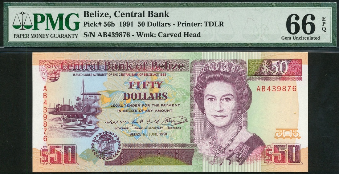 Central Bank of Belize, $50, 1 June 1991, serial number AB 439876, purple and multicolour, portrait Queen Elizabeth II at centre right, harbour scene at left, arms low centre left, reverse, bridges of Belize