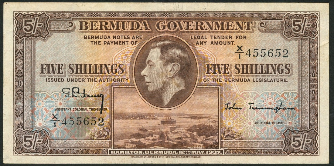 Bermuda Government, 5/-, ND (1937), serial number X/1 455652, King George VI at centre, 5/-, 1957, serial number X/1 121834, 10/-, 1957, serial number R/1 576742, Queen Elizabeth at centre