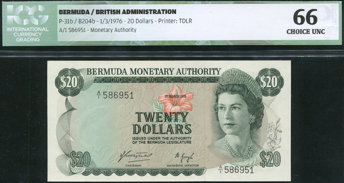 (Pick 31b, TBB B204), in ICG holder number 66, choice uncirculated. The 1976 $20 series is as scarce as the 1974 $20 series when compared in this grade